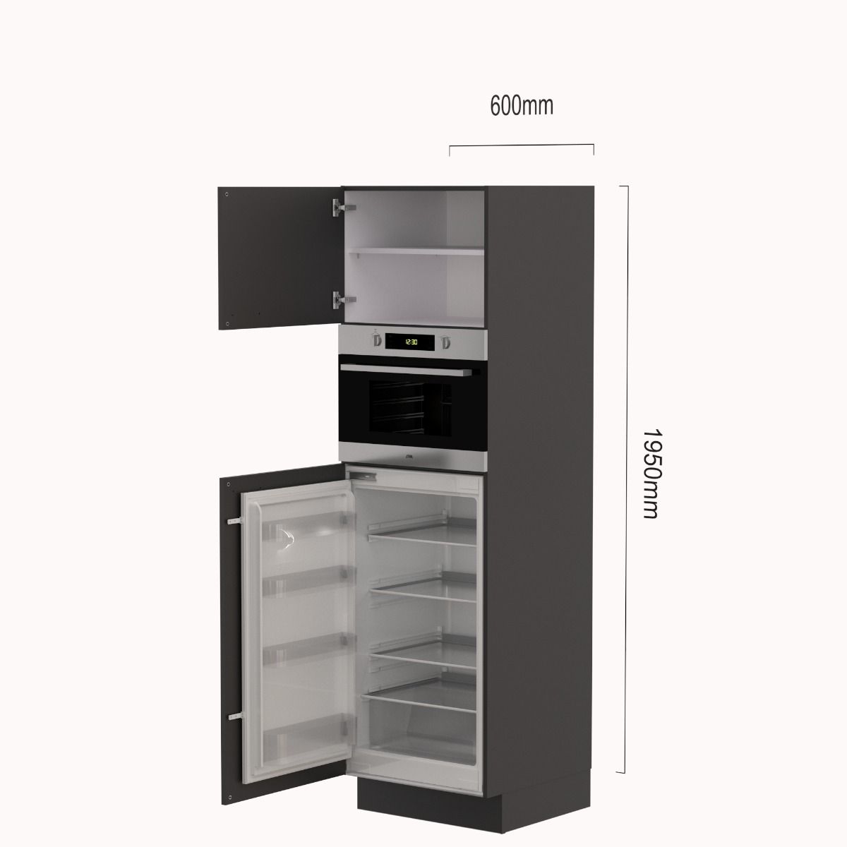 Deze 195 cm hoge apparatenkast heeft twee draaideuren. Achter de onderste draaibeur bevindt zich een 102 cm nis t.b.v. de koelkast. Daarnaast biedt de kast een nis t.b.v. een combimagnetron.