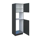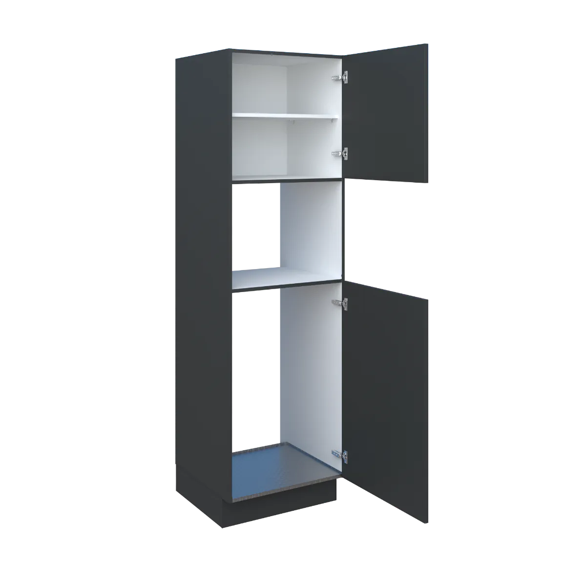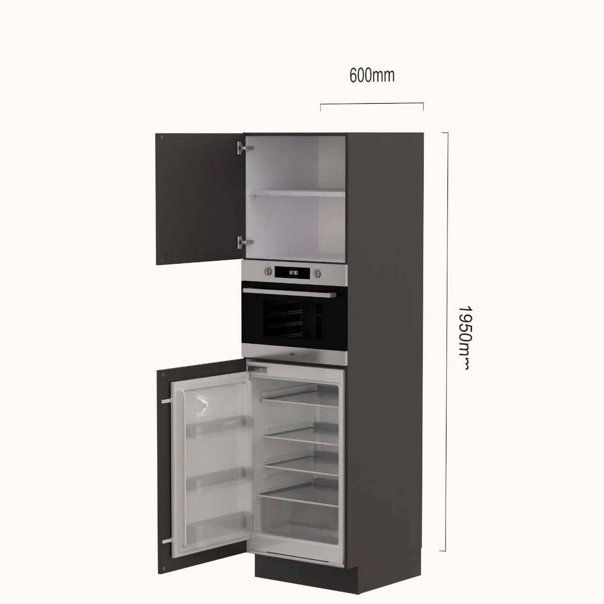 Deze 195 cm hoge apparatenkast heeft twee draaideuren. Achter de onderste draaibeur bevindt zich een 88 cm nis t.b.v. de koelkast. Daarnaast biedt de kast een nis t.b.v. een combimagnetron.