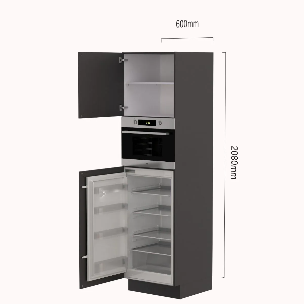 Deze 208 cm hoge apparatenkast heeft twee draaideuren. Achter de onderste draaibeur bevindt zich een 102 cm nis t.b.v. de koelkast. Daarnaast biedt de kast een nis t.b.v. een combimagnetron.