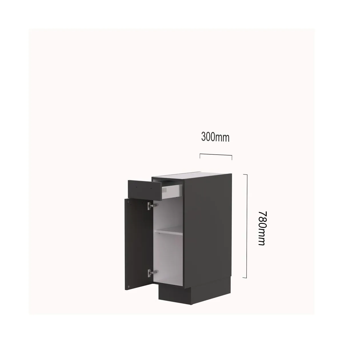 Deze onderkast heeft een draaideur, voorzien van luxe 107° metalen clip-top scharnieren met rechte steun en een lichtgrijze lade die is voorzien van softmotion demping voor een geruisloze sluiting.